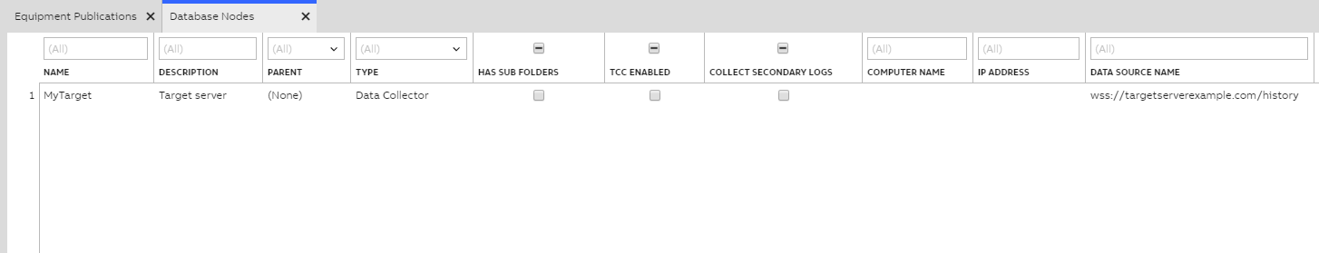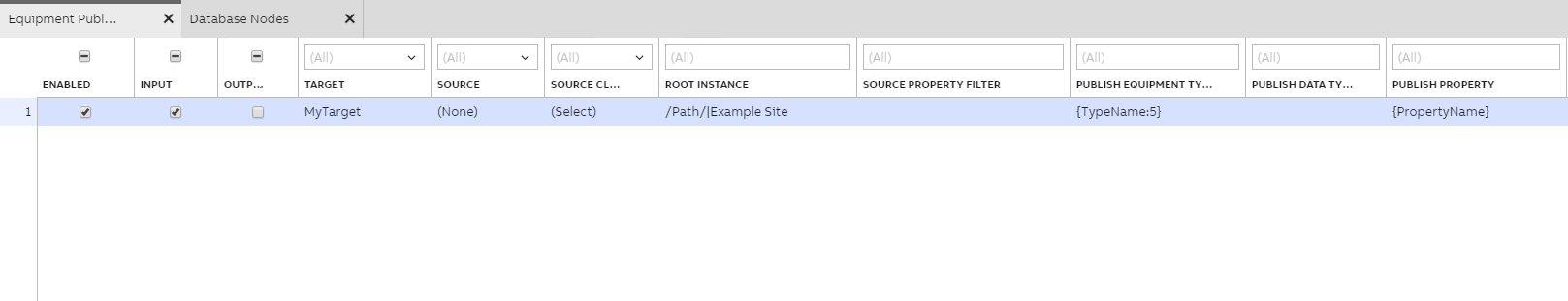 In Engineering UI, open EquipmentPublication class list view. Create the following entry. This will publish all instances of process path under specified root instance to target defined as MyTarget in Database Nodes.