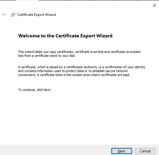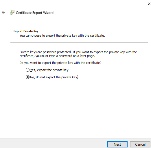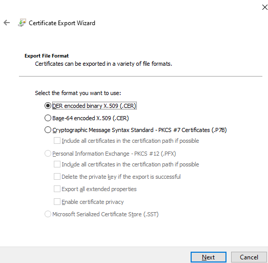 Keep the default selection (DER encoded binary X.509 (.CER) in the next screen and click on Next