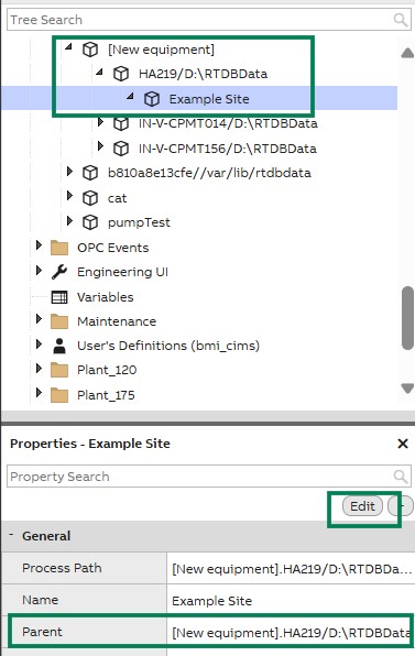 This same tree structure "Example Site" and its child downwards should appear in the target system after the Equipment publication row is created and committed with "Enabled" set to true.
