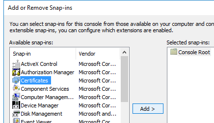 - In the following list, click Certificates and Add then select Computer account → Next → Local computer → Finish → OK.