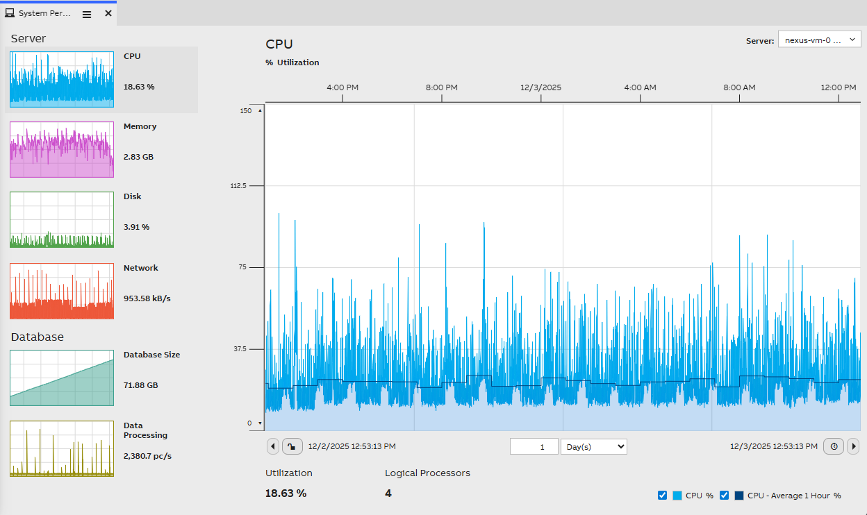 - On the left side, you will find navigation buttons for each section (CPU, Memory, Disk, Network, Database Size, Data Processing).
