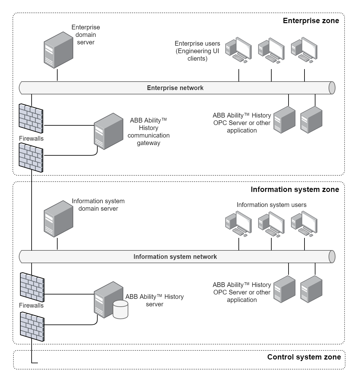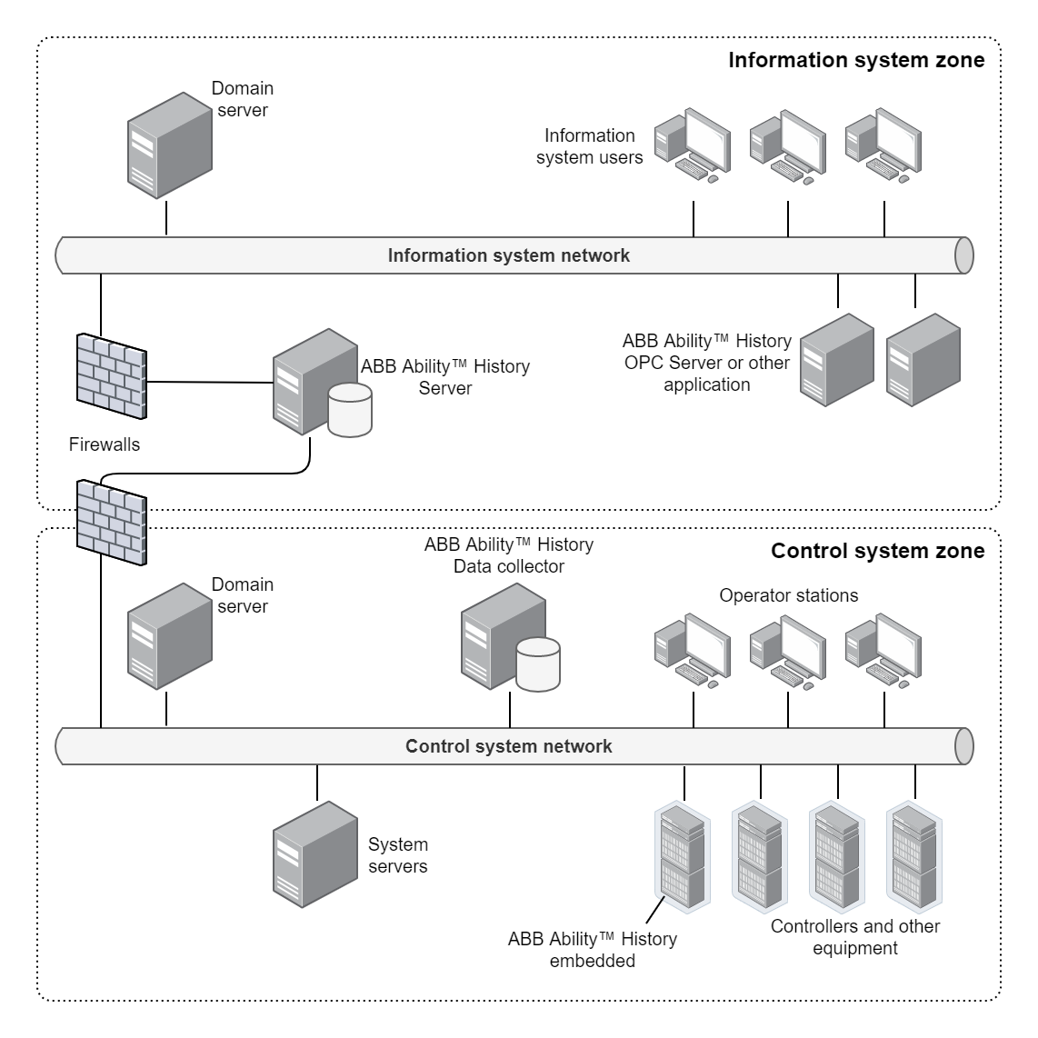 When ABB Ability™ History is used as an information system platform, it is typically installed to an information system network that is isolated from the control system network with a firewall, and also from all the other systems in the information system network. Typically ABB Ability™ History is connected to be part of the information system domain. One ABB Ability™ History server can be connected to several data collectors in different control systems.