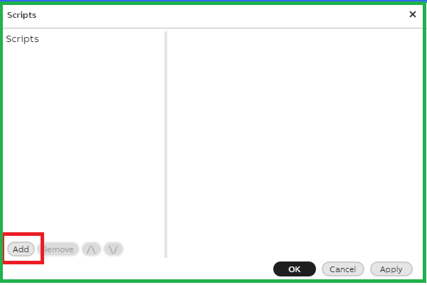 Click the "Add" button in the script popup to introduce a new script. An empty script is added, as illustrated below. Users can add multiple scripts to a single dashboard for enhanced customization.