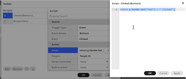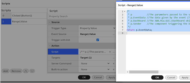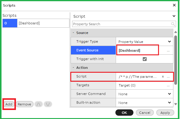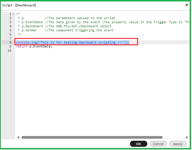 To exemplify, let's craft a sample script. Click on the ellipses in the Action section to access the JavaScript editor popup with default parameters. Additionally, insert a straightforward JavaScript console log message to verify the scripting functionality. Save the script by clicking "Apply" and close the popup with "Ok." Confirm by clicking "Ok" in the Scripts popup, and then save and close the dashboard.