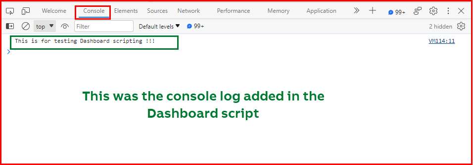 Now, open the browser's developer tools and navigate to the Console tab, as shown below. Open the scripted dashboard to observe the console log added in the script within the browser console.