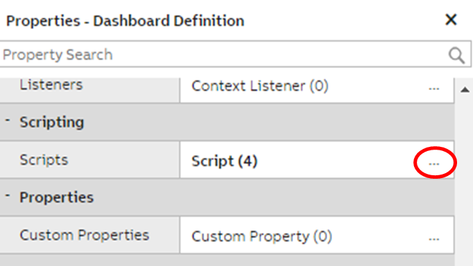 To add scripts, navigate to the Scripting properties section within the View Dashboard. Users can access the script popup by clicking on the ellipses, as depicted in the screenshots below.