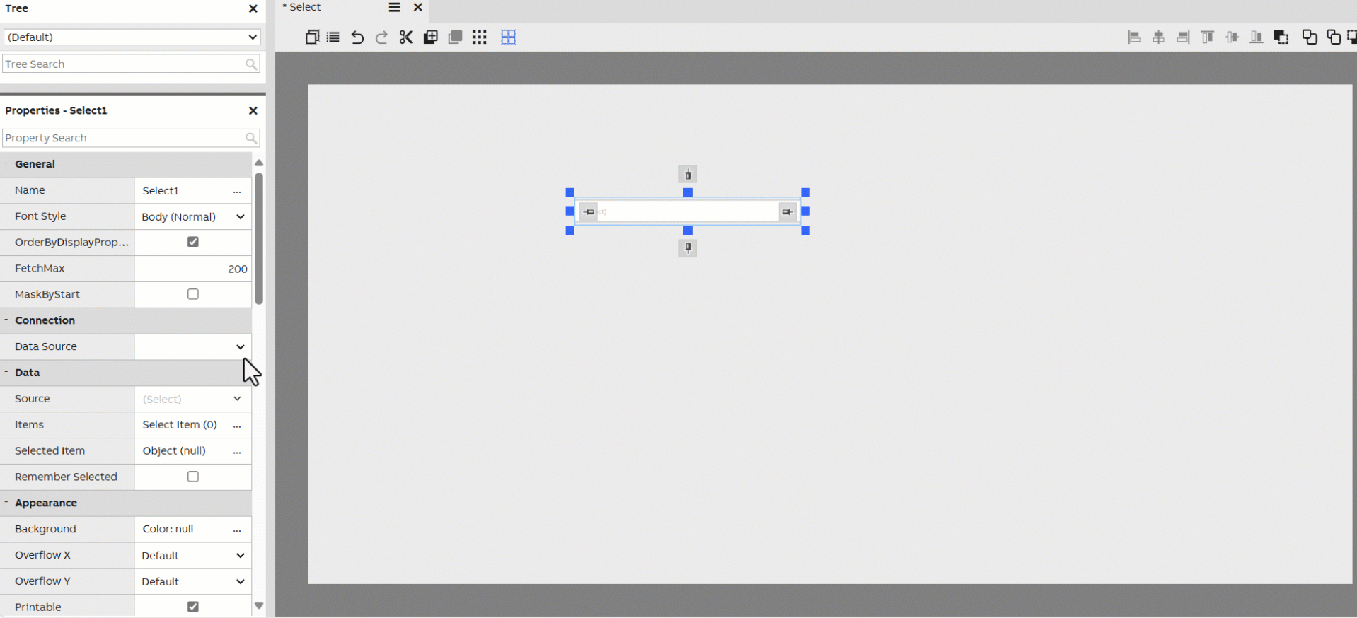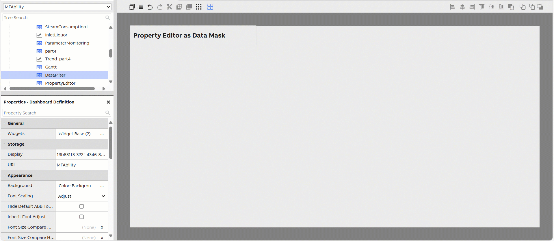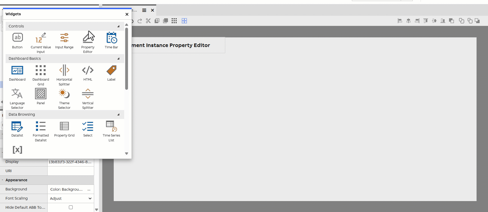 Property Grid can be used in showing and editing properties from a widget, a component or a database class instance. E.g. In dashboards a Property Grid widget can be set to listen to context from a Navigation Tree widget to show the properties of the selected item.