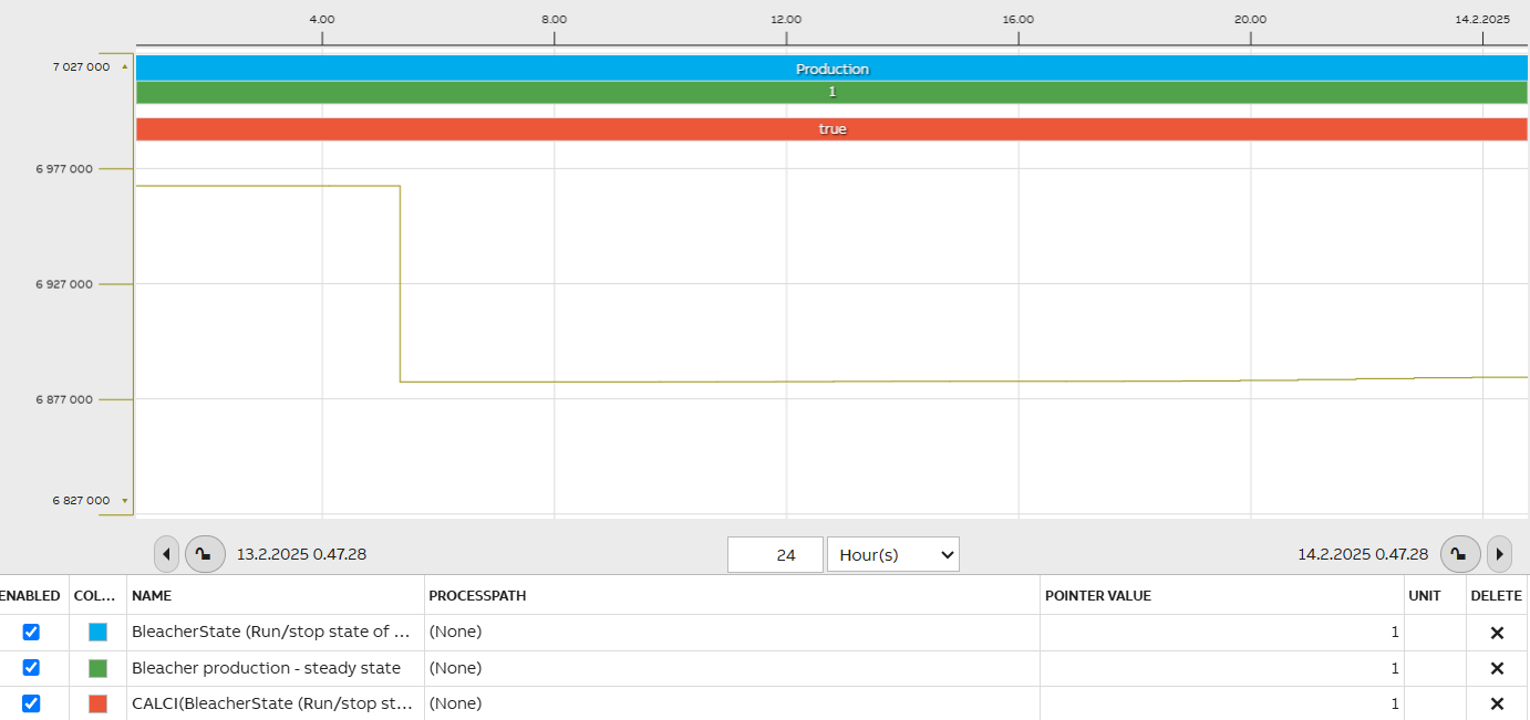 The Time Series List widget allows for simple displaying of the values of a historized property; it acts as a grid-based alternative to the Chart widget. Like the Chart widget, it can be connected to a Time Bar.