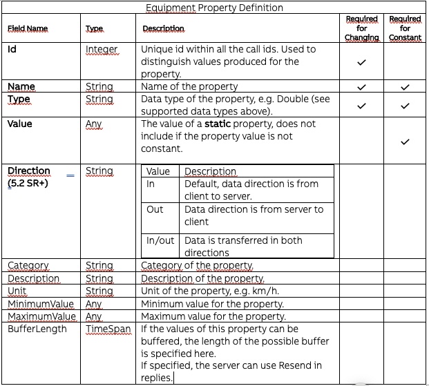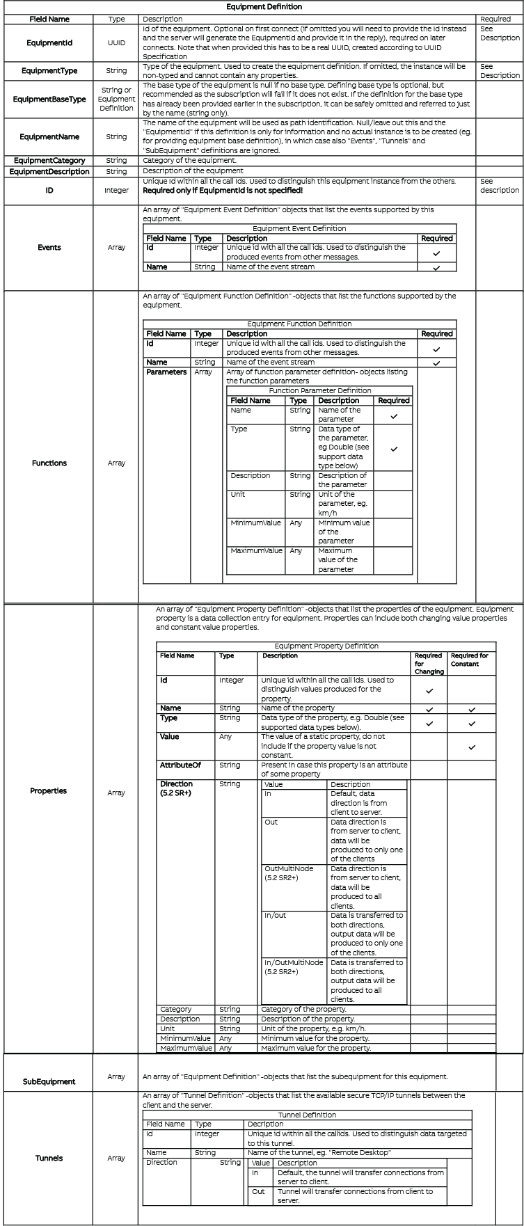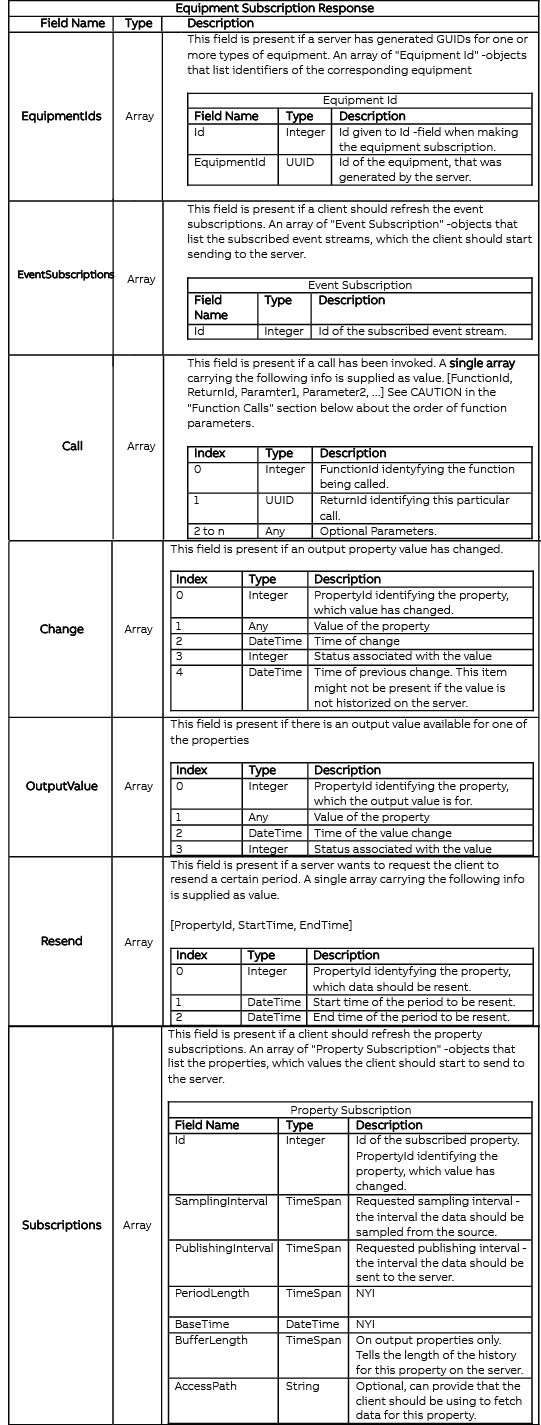 | SubscribeEquipmentSession | Equipment Definition | Equipment Subscription Response | Initialises a session with a server that allows data and event production as well as the server to invoke function calls back to the client according to the definition provided by the client. |